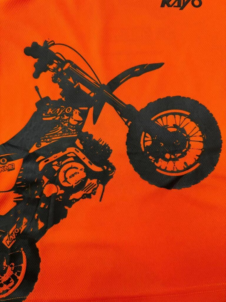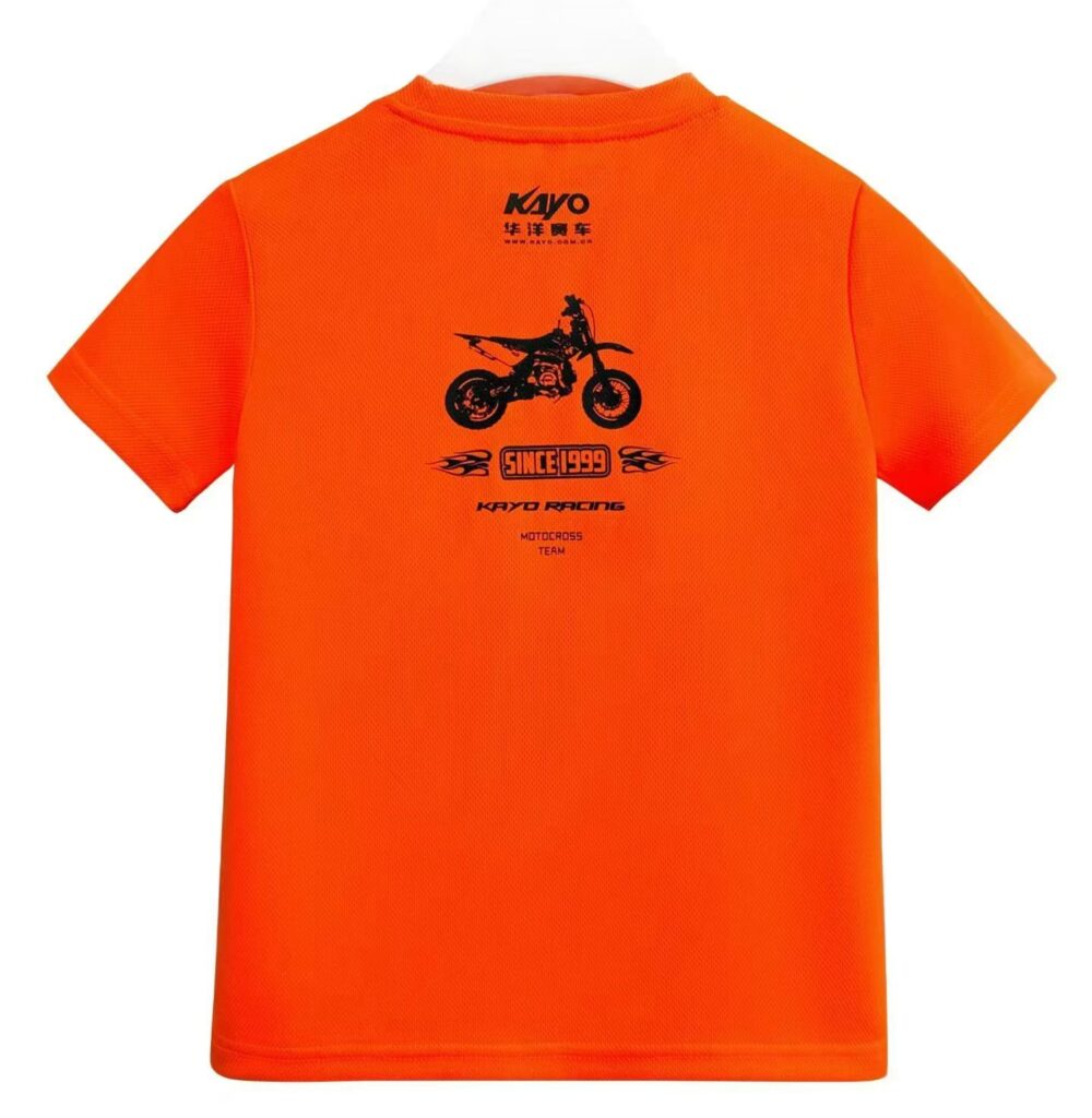 The client required a high-visibility, moisture-wicking children’s T-shirt suitable for motocross activities, combining functional performance with bold brand aesthetics.